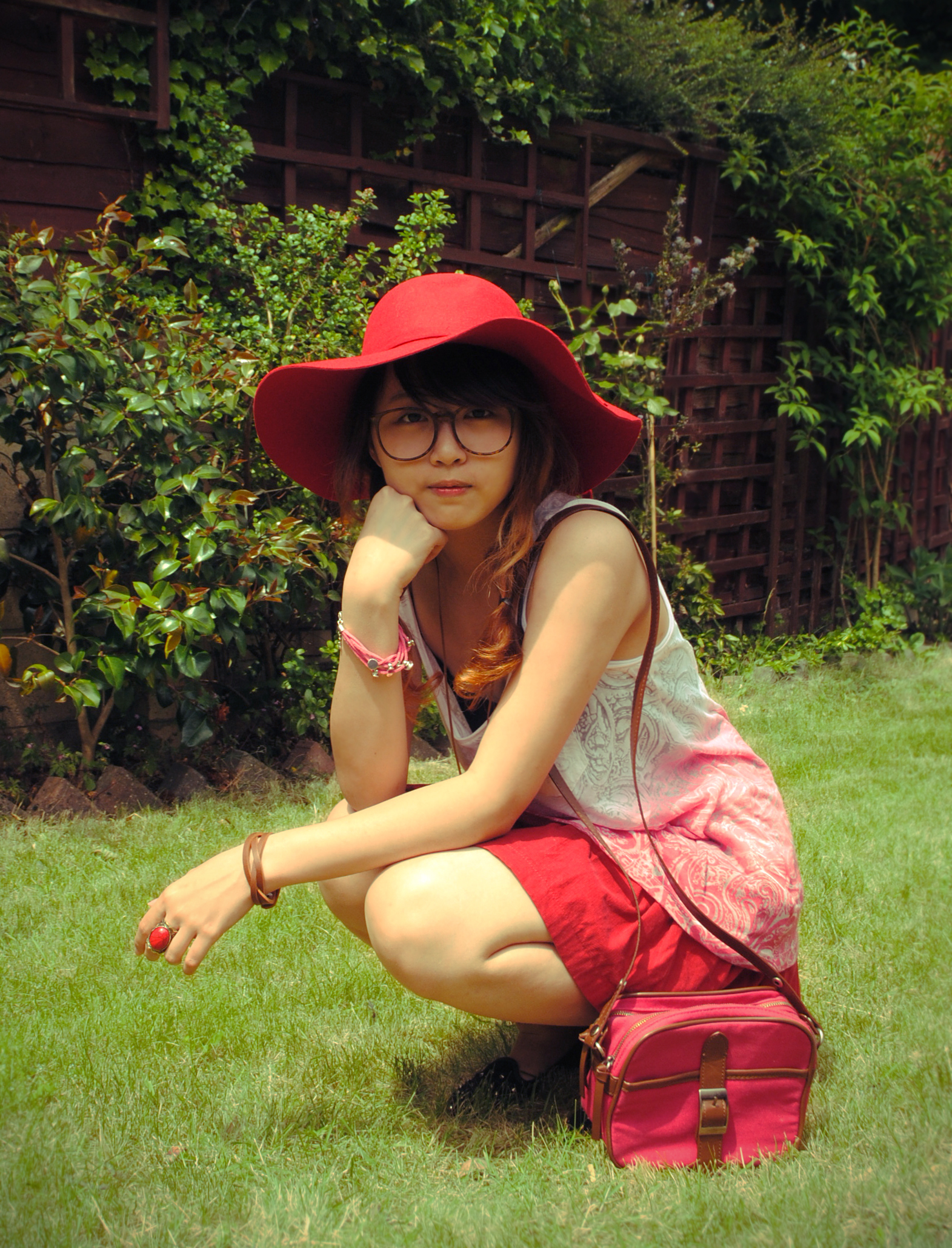 The red/fuchsia bag is also here to compliment the skirt :P since it has brown leather lining, I wear a brown leather bracelet to kind of like toning down the colours a bit.