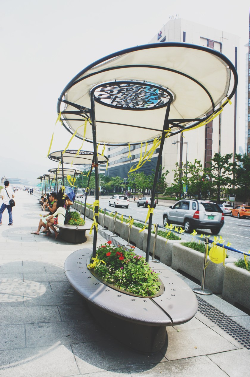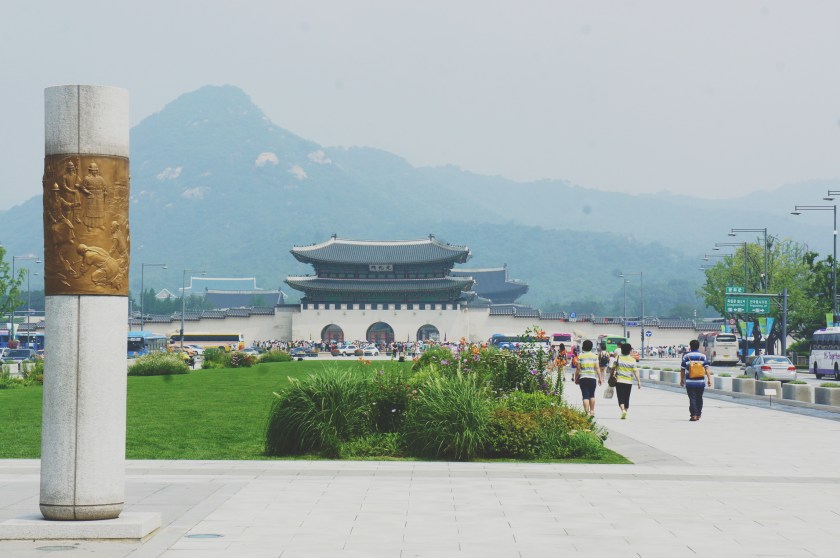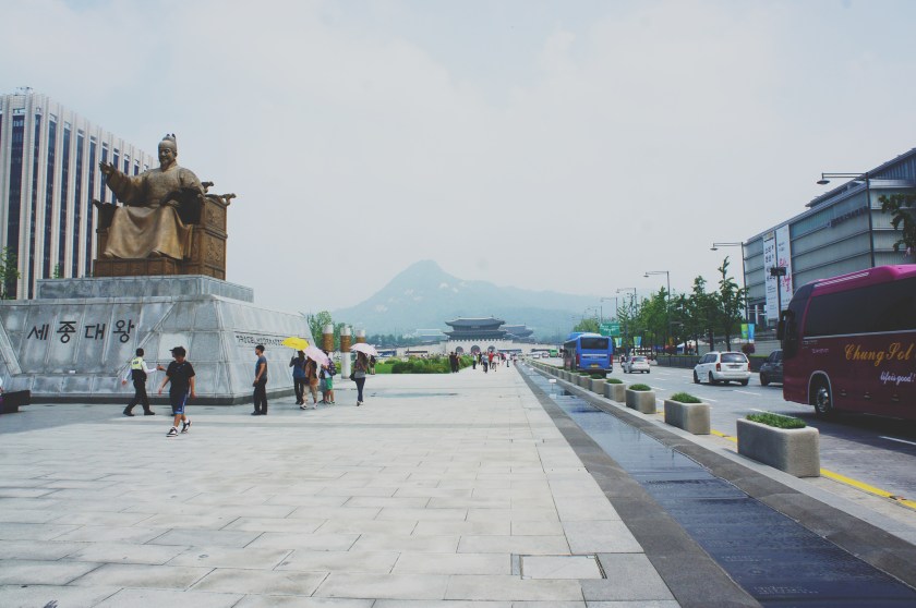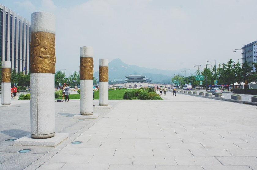 Gwanghwamun Square is right outside, opposite of Gwanghwamun Gate where you entered the palace. The square is a national landmark and a public area where many activities occur (people leisurely hanging around, celebrities busking, rallies…).